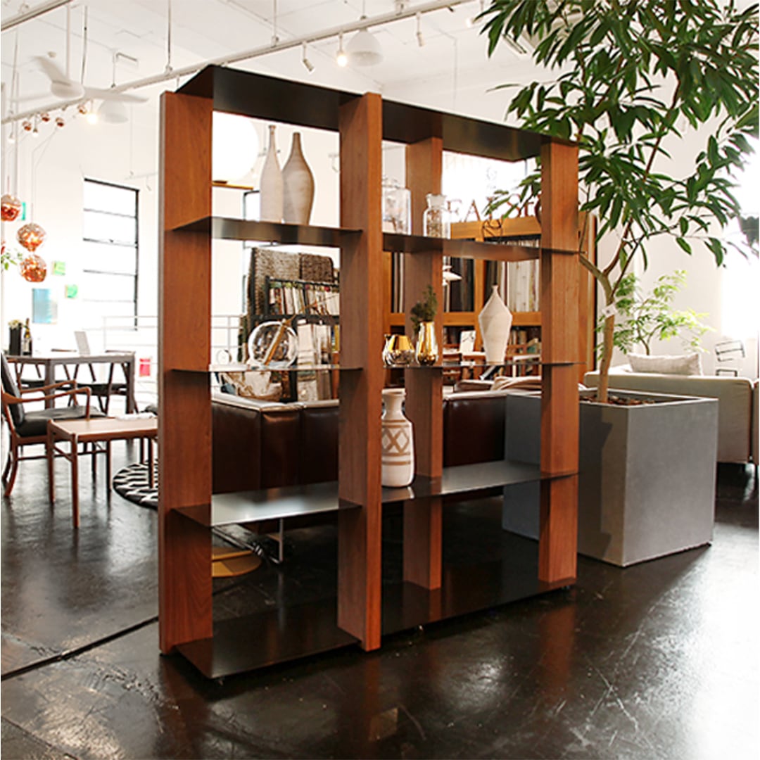 「PILLAR」とは「柱」を意味します。木製の支柱がそれぞれランダム感のある配置にされることで森や林の木々をイメージさせ、存在感とともに凛とした佇まいに空間が引き締まります。棚板は3mmと薄いアイアン製ですっきりとした抜け感があります。支柱が90度異なる角度になっている事で本などの正面を向けたみせる収納もでき、支柱の配置の方向性の無さから、壁を背に設置をしない間仕切りとしても使用できるシェルフです。