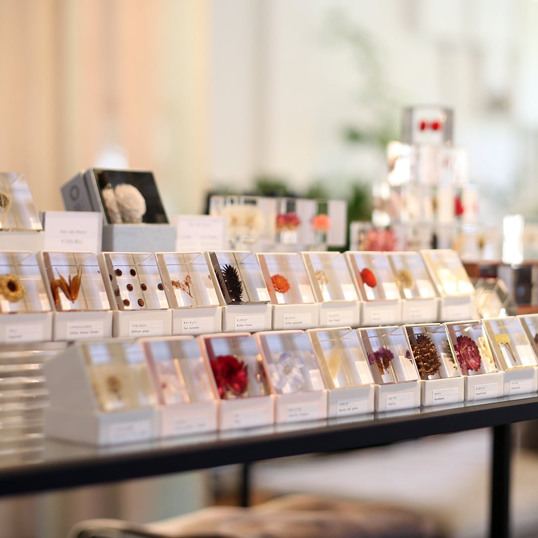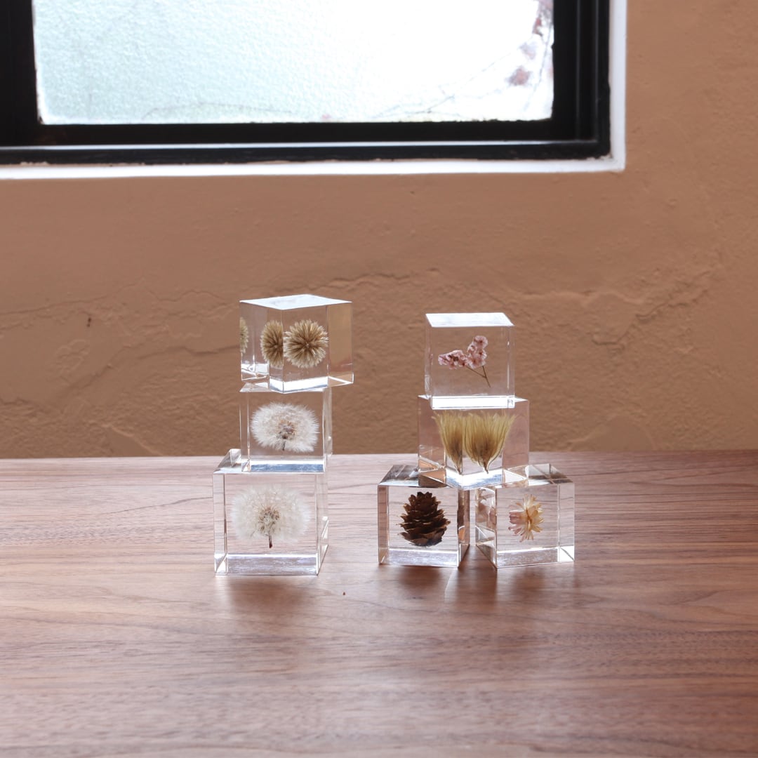 土台作成から加圧、熱処理、加工、そして研磨まで、ひとつずつ丁寧につくられるキューブは完成までに1週間~10日ほどの時間を要して作られます。繊細な花や実をキューブにする技術は職人の手と技に支えられています。生活を彩るインテリアやギフトに。またお子さま向けの知育玩具として。あらゆる世代の方にお楽しみいただけます。
