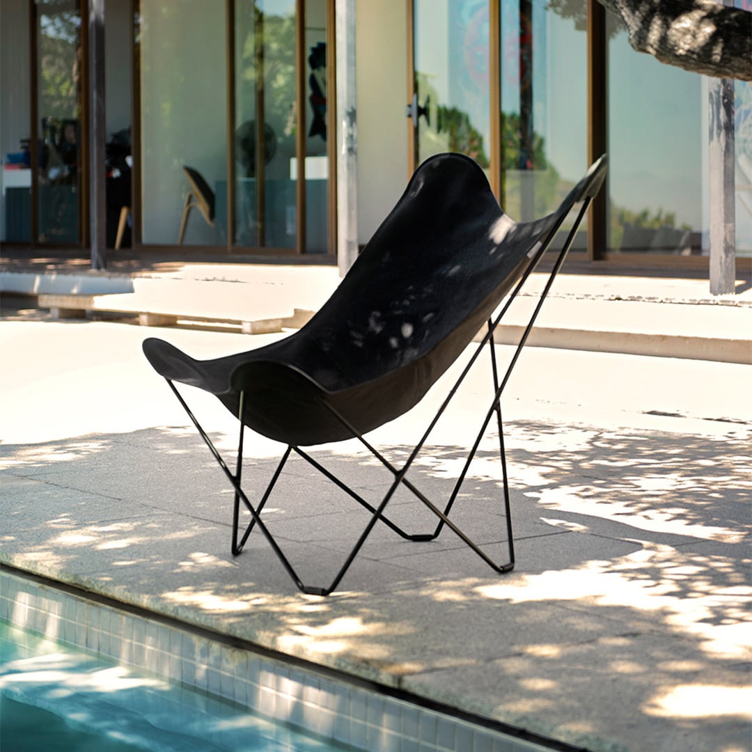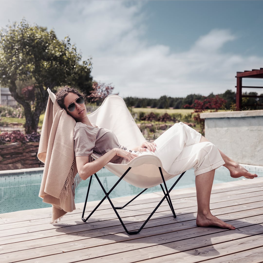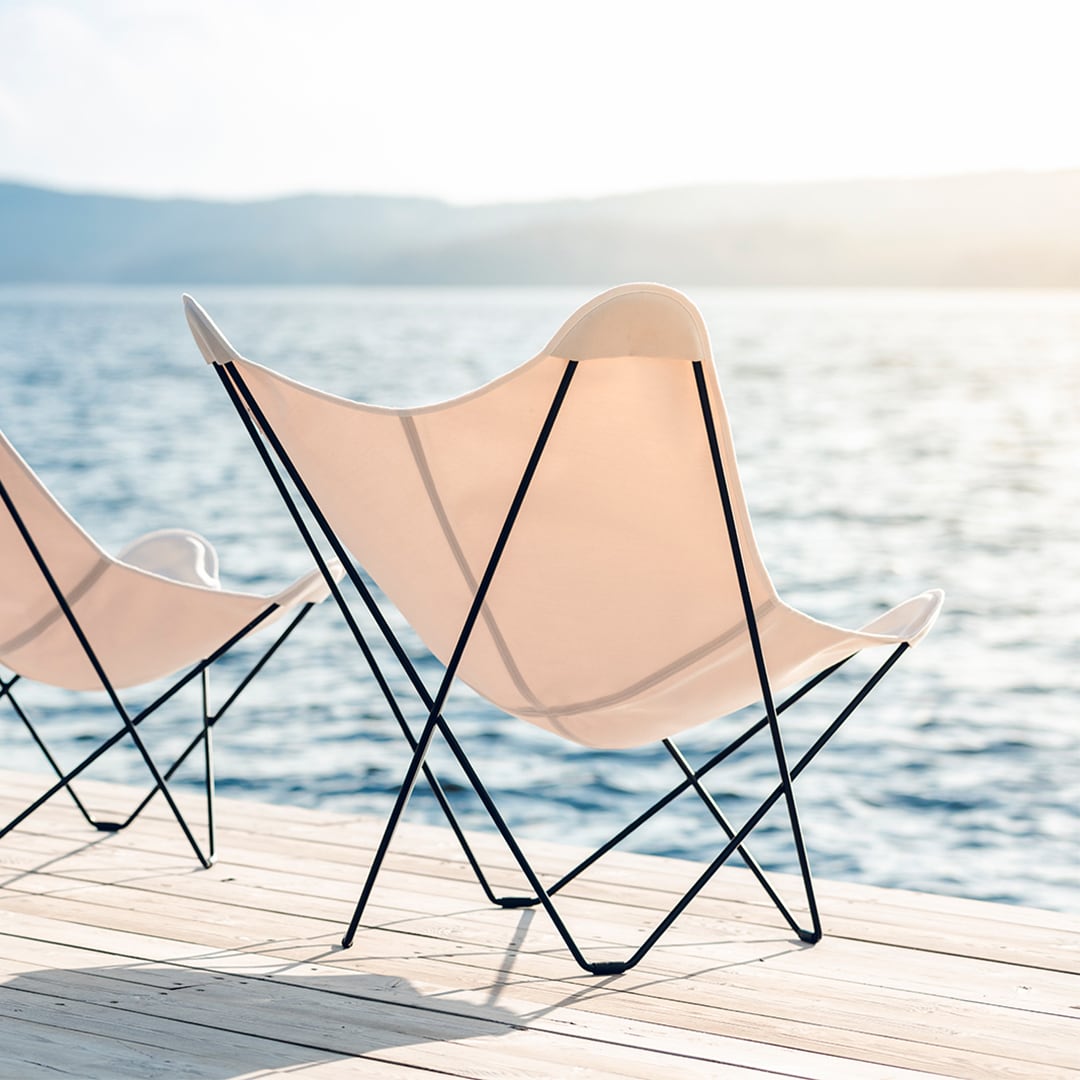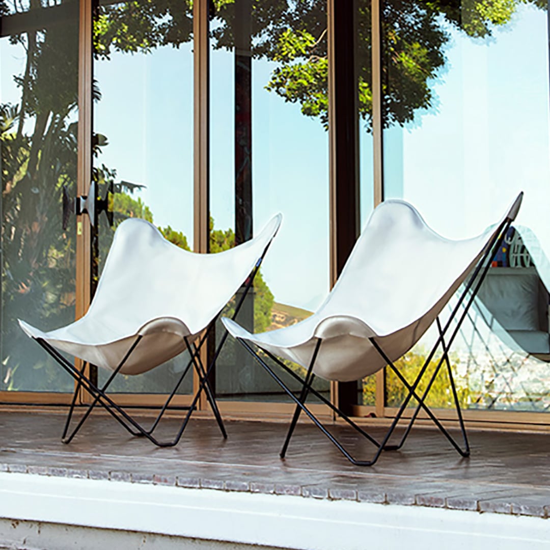 デザイナーズチェアとして有名なバタフライチェアのデザインをそのままに、屋内やテラス、お庭でも気軽に使用できるリラックスチェアとしてフレームと生地が進化しました。日差しにも強いサンブレラは退色しにくく、お手入れが簡単な機能的な素材です。
