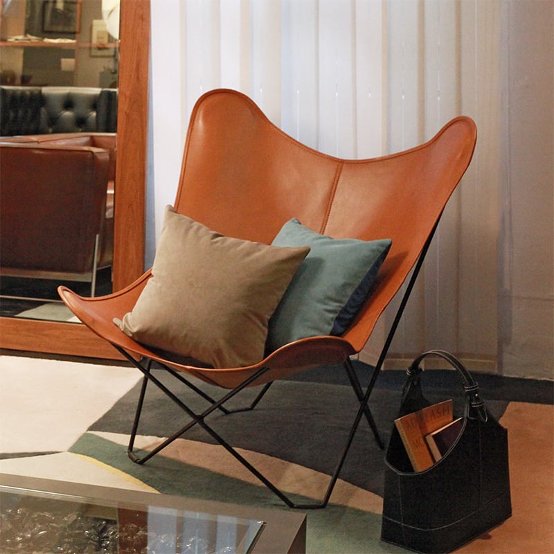 “バタフライチェア”の愛称でも知られる「BKFチェア」は、3人のアルゼンチン人デザイナー(アントニオ・ボネット、フアン・クルチャン、ホルヘ・フェラーリ=ハードイ)によってデザインされ、それぞれの頭文字をとってBKFチェアと名づけられました。3人のデザイナーは20世紀を代表する建築家のル・コルビュジエの下で働いた経験を持ちますが、この椅子からはその影響はあまり感じられません。それよりも、イギリスのエンジニアのヨゼフ・フェンビィが1855年にデザインした椅子にインスピレーションを得て、誕生しました。またBKFチェアの黄金時代である1950年代には、500万脚ほど製造され、何年にもわたり数多くの芸術家に愛されてきました。レザーの柔らかい曲線が座りたくなるカタチをしています。シンプルなのに存在感があり、リラックスした寛ぎの空間づくりにおすすめです。またレザーの経年変化を楽しむことができます。