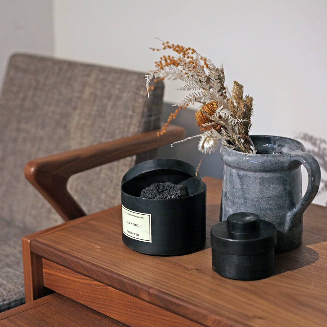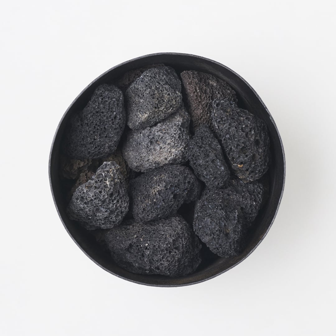 無骨なラバロック(溶岩石)は視覚的にも楽しめます。天然素材を蒸留抽出した香りのエッセンスをたっぷりと染み込ませており、蓋を開けた瞬間から命を吹き込まれたかように香りが広がります。