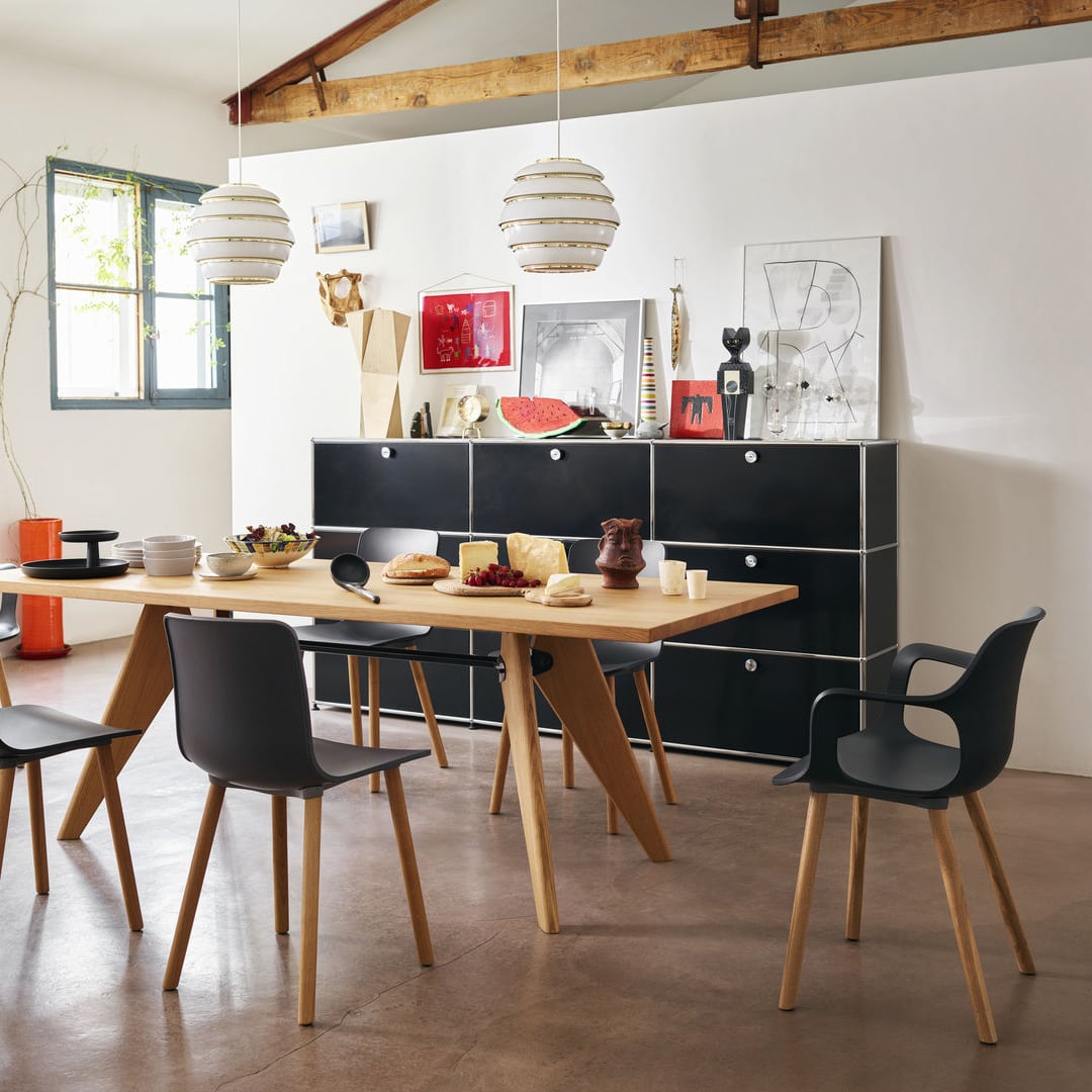 ジャン・プルーヴェは、第二次世界大戦中の金属不足を受け、天板だけでなく脚も木製の「テーブル ソルヴェイ」を開発しました。無垢材の重厚感が、プルーヴェの洗練されたデザインを引き立たせています。 彼の構造哲学に基づきデザインされたこのテーブルは、細部にわたりその哲学が貫かれています。傾斜のついた脚は天板の下に沿ったバーと連結し、天板にかかる重さを床へ逃がせる構造になっています。これは、一般的に建物のような構造体でしか見られないような仕組みです。