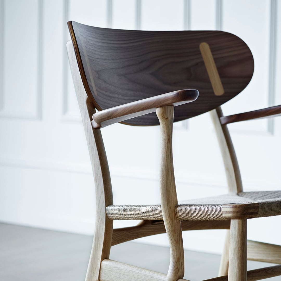 ハンス J. ウェグナーのラウンジチェア CH22は、カール・ハンセン&サンにより2016年、数十年の年月を経て生産が再開された復刻モデル。アームレストの形状、ペーパーコードを施した座面、そして印象的な成形合板製の背もたれ。随所にウェグナーデザインならではの特徴が見られる椅子となっています。そして、背に施された木製の楕円形の埋木。ウェグナーならではの印象的な意匠です。また、優れた職人の技も各所に見ることができます。座面フレームのコーナーに施されたフィンガージョイント、前脚の接合に用いられた木製の楔。フレームと別素材を用い美しいコントラストを創り出しています。