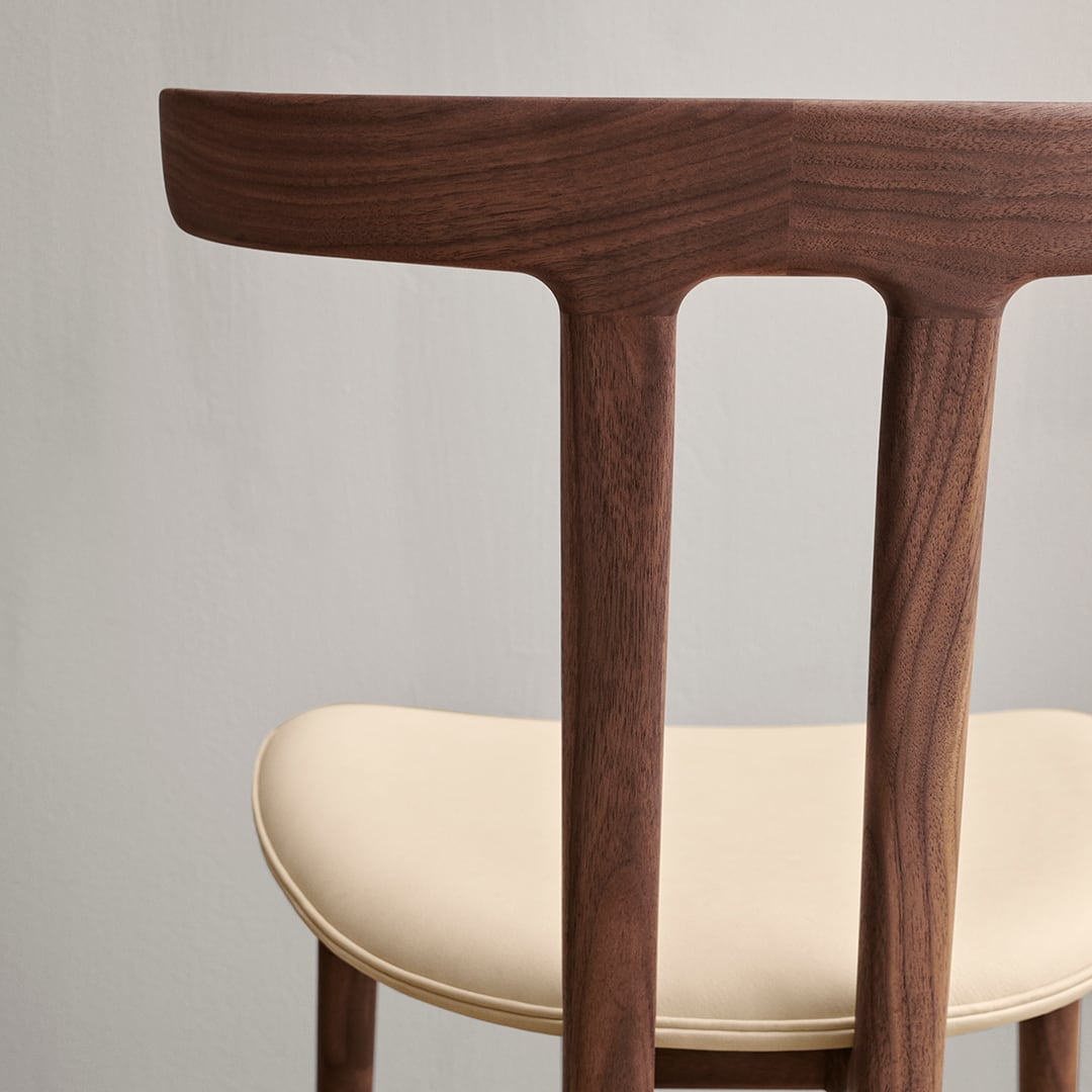 OW58 T-チェアの製作には手間のかかる、入念な製作工程が要求されます。なめらかで、流れるような仕上げが求められる各部の接合にはこれが特に顕著です。そしてこの椅子の最も大きな特徴となっているがT字形を構成する背もたれと後ろ脚の意匠。2本の後ろ脚が近接し一つに見えることから、3本脚の椅子にも見えます。
