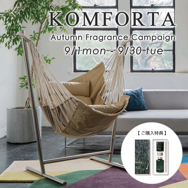 期間中「KOMFORTA(コンフォルタ)」を1台ご購入いただいた方に、北欧の森をイメージした香り『 スカンジナビスク スコッグ キャンドル & ディフューザー ギフトセット 』をプレゼント!心地よい秋のひとときを香りとともにお楽しみください。