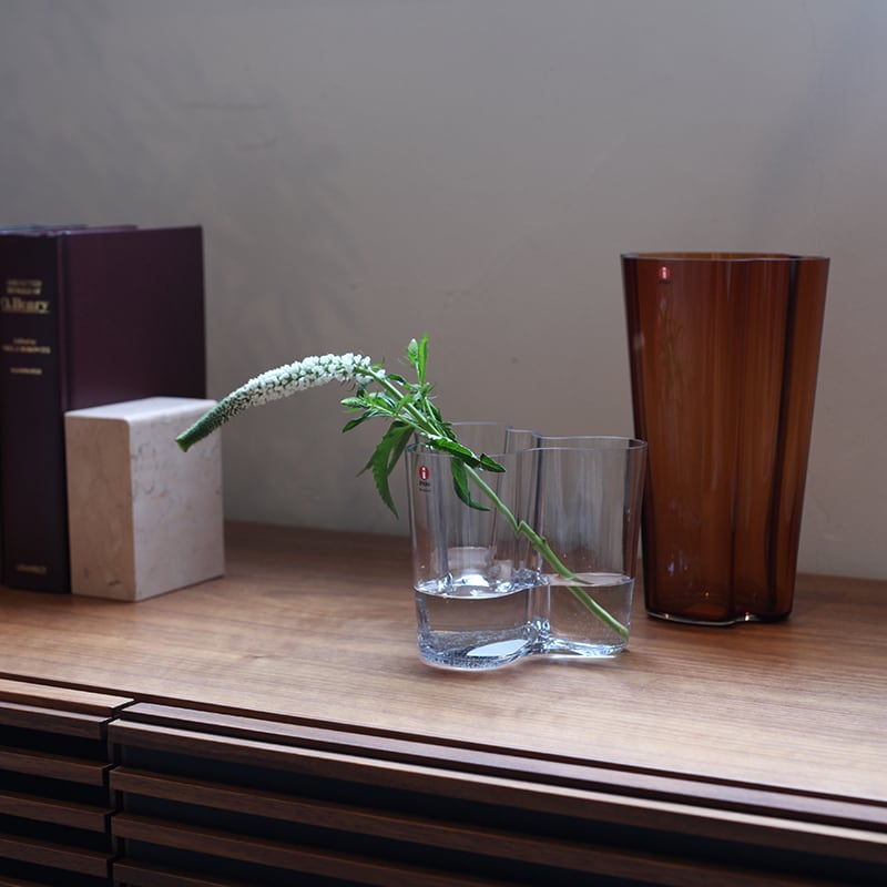 フィンランドを代表する近代建築/デザインの巨匠、アルヴァ・アアルトにより1936年に発表され、翌年開かれたパリ万博に出品されました。世界で最も有名なガラス作品のひとつであり、フィンランドデザインの象徴ともいわれています。流れるような有機的なフォルムのモチーフは、フィンランドの湖の形、白樺の根本付近の断面形状など諸説存在します。ベースは、イッタラの工房で今も手吹きで制作されており、熟練の職人7人が力を合わせてひとつのベースを完成させます。