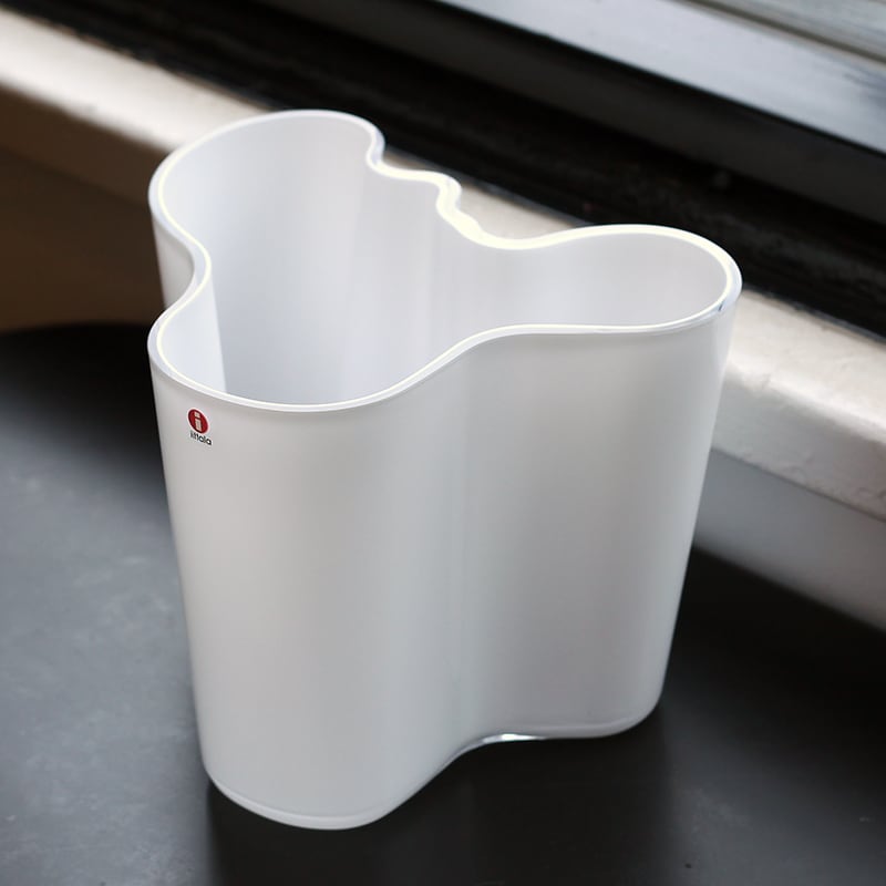 フィンランドを代表する近代建築/デザインの巨匠、アルヴァ・アアルトにより1936年に発表され、翌年開かれたパリ万博に出品されました。世界で最も有名なガラス作品のひとつであり、フィンランドデザインの象徴ともいわれています。流れるような有機的なフォルムのモチーフは、フィンランドの湖の形、白樺の根本付近の断面形状など諸説存在します。ベースは、イッタラの工房で今も手吹きで制作されており、熟練の職人7人が力を合わせてひとつのベースを完成させます。