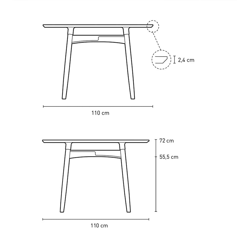 モダンな印象の直径110cmのラウンドテーブル。ダイニングをはじめ、オフィスでの使用も想定されており、天板はフェニックス塗装が施されています。汚れや傷にも強く水拭きが可能。在宅ワークにも最適なテーブル。細部に感じられるデザインの配慮とウェグナーへの敬意にはYチェアとの組み合わせを想定していたかの様。集うにぴったりなサイズの2~4人掛け用テーブルです。