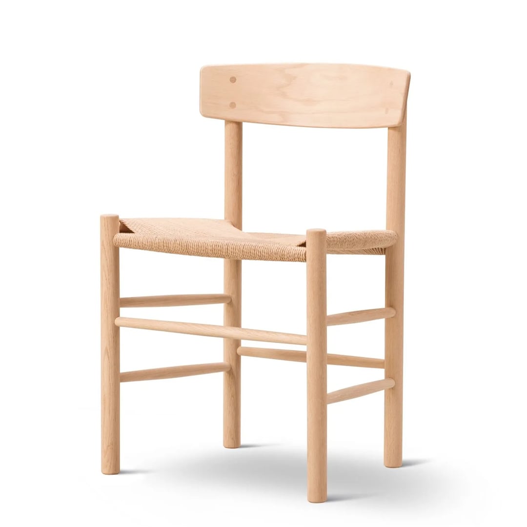 デンマーク家具デザインの原点といえる「J39モーエンセンチェア」。モーエンセンがFDB(生協)の家具デザイナーとして活躍していた際に、「適正な価格で強度のあるチェア」というミッションで作られたシェーカースタイルのダイニングチェア。彼の目指した「簡素で誠実なデザイン」が良く表現され、モーエンセンの代表作といえるチェアとなりました。洗練されたデザインと、手編みの座面、背もたれの快適性より75年以上絶えることなく生産され続け、世界で高い評価を得ています。建築大学やレストラン、ロイヤルコペンハーゲン工場の絵付の作業時のチェアとして採用されていたことから、その強度と長時間掛けても疲れない椅子として定評があります。