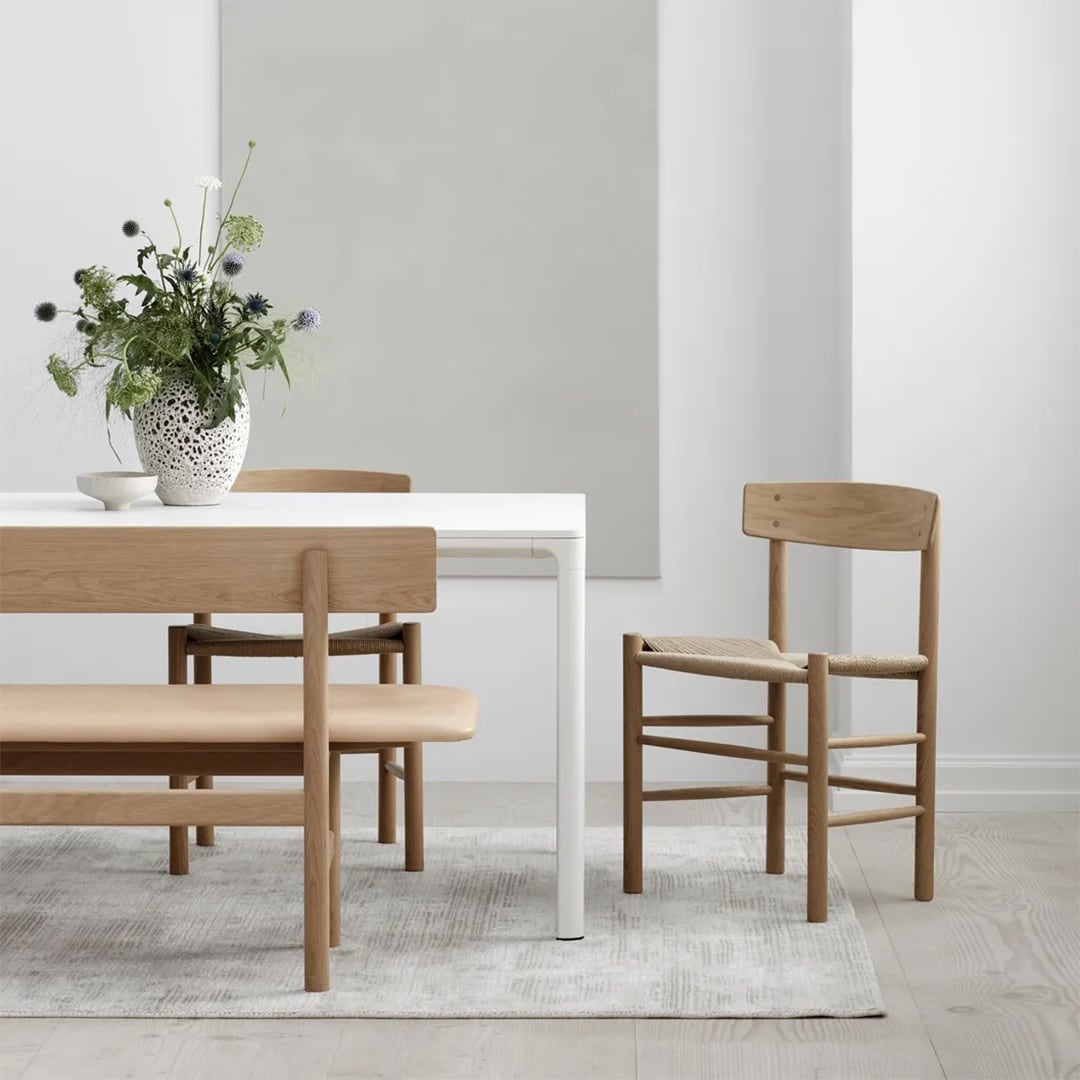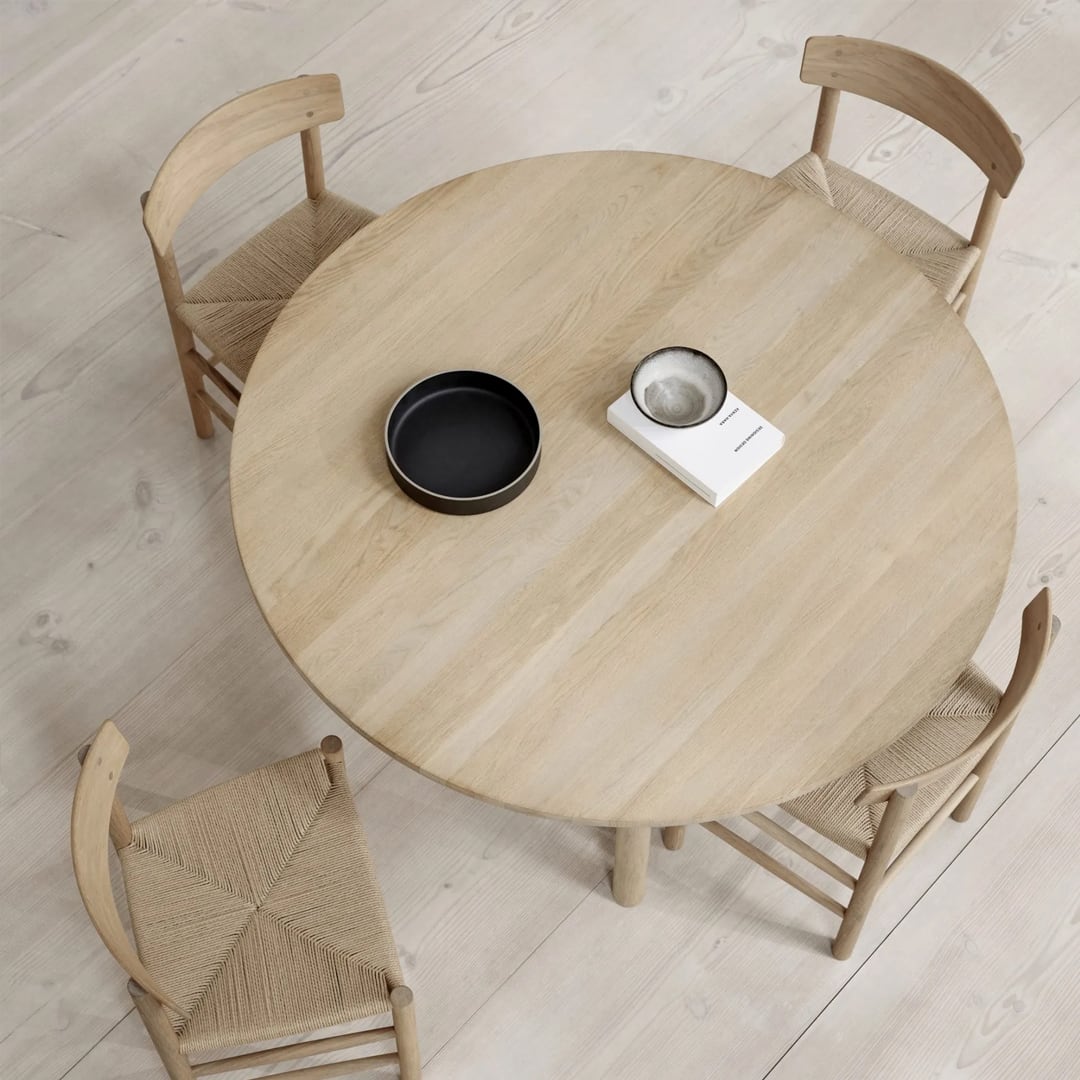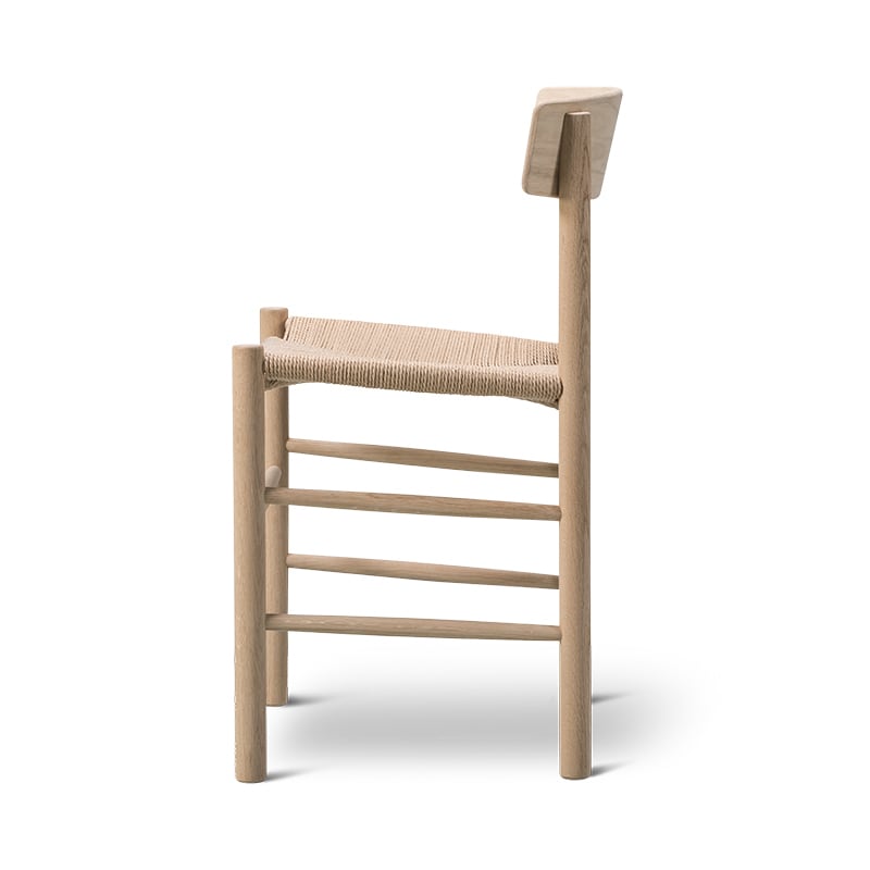 デンマーク家具デザインの原点といえる「J39モーエンセンチェア」。モーエンセンがFDB(生協)の家具デザイナーとして活躍していた際に、「適正な価格で強度のあるチェア」というミッションで作られたシェーカースタイルのダイニングチェア。彼の目指した「簡素で誠実なデザイン」が良く表現され、モーエンセンの代表作といえるチェアとなりました。洗練されたデザインと、手編みの座面、背もたれの快適性より75年以上絶えることなく生産され続け、世界で高い評価を得ています。建築大学やレストラン、ロイヤルコペンハーゲン工場の絵付の作業時のチェアとして採用されていたことから、その強度と長時間掛けても疲れない椅子として定評があります。