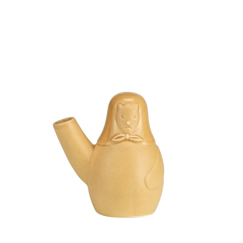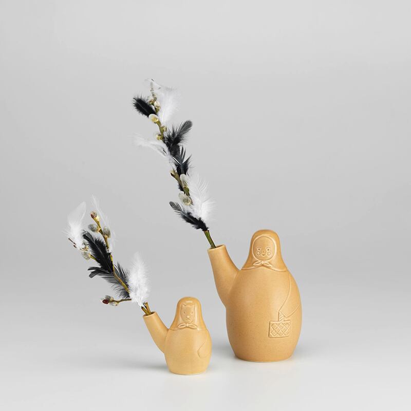 セラミック製の花瓶「イースタードッグ ベース」は、フィンランドの春の行事であるイースターをもとに製作されました。フィンランドに春が訪れる4月、子供たちは魔女のように着飾り、色とりどりの羽をつけた枝を手にして冬の終わりを祝福します。小さな魔女たちは、町の家々を訪ねて祝福を振りまき、お礼のお菓子をもらいます。町に良い一年がやってくることを祈り、子供たちは” Virvon, varvon, tuoreeks terveeks, tulevaks vuodeks; vitsa sulle, palkka mulle ” 「新年が良い年になれ。木の棒と交換におやつをちょうだい。」と唱えます。アルテックの「FIN/JPN フレンドシップ コレクション」のために、フィンランドのデザインデュオのカンパニーがデザインした6つのセラミック製小物シリーズに名を連ねるイースタードッグベースは、犬の主人である魔女を象った「イースタードッグ ベース」とペアになる製品です。