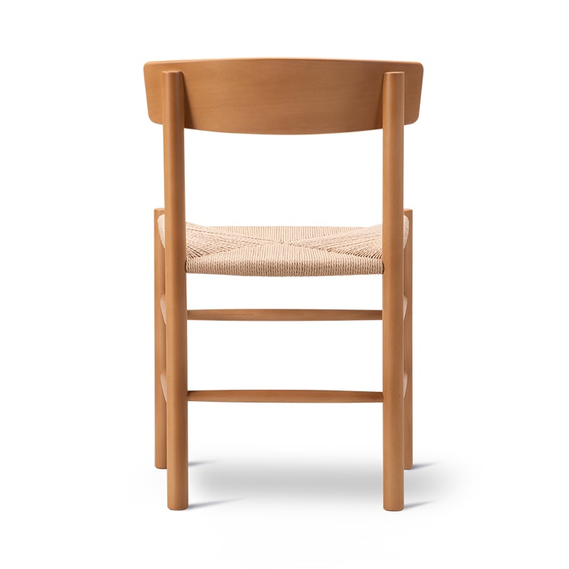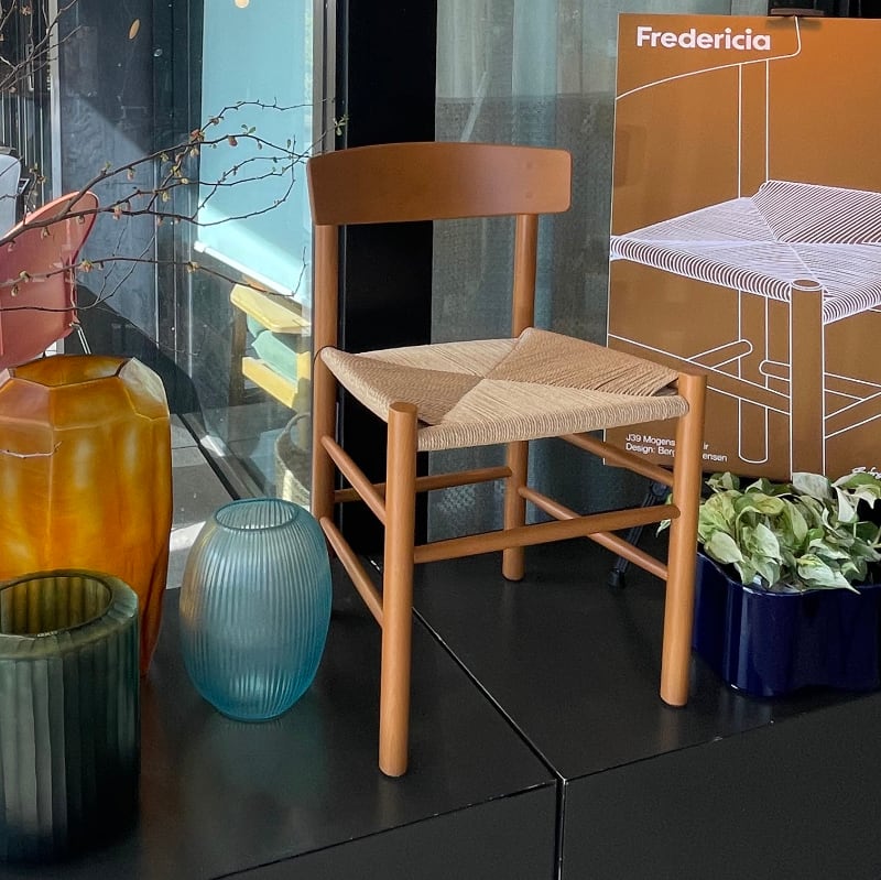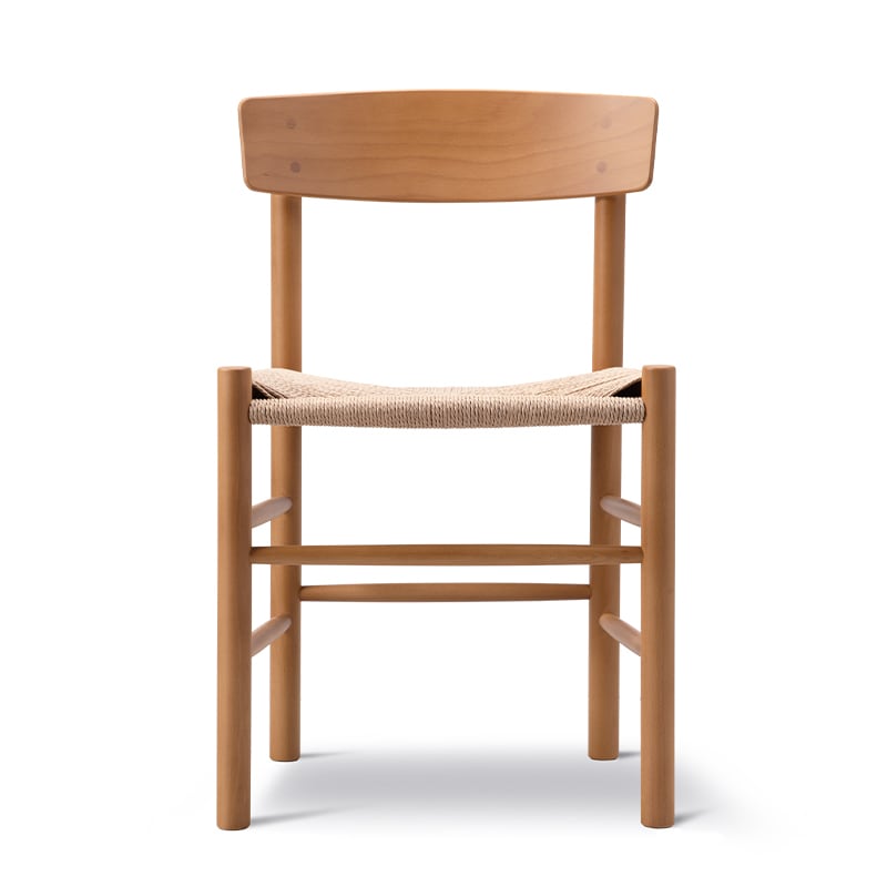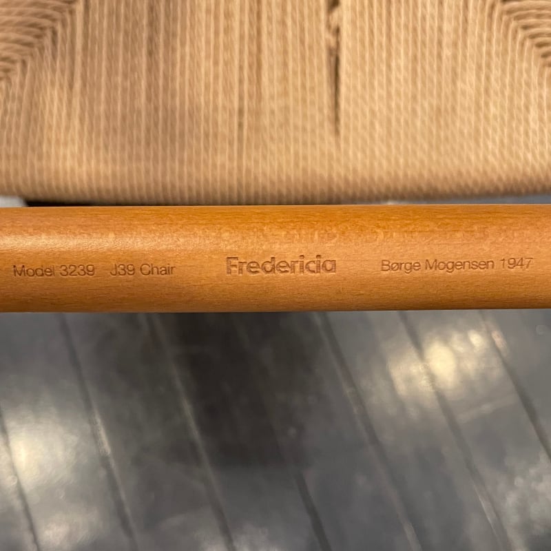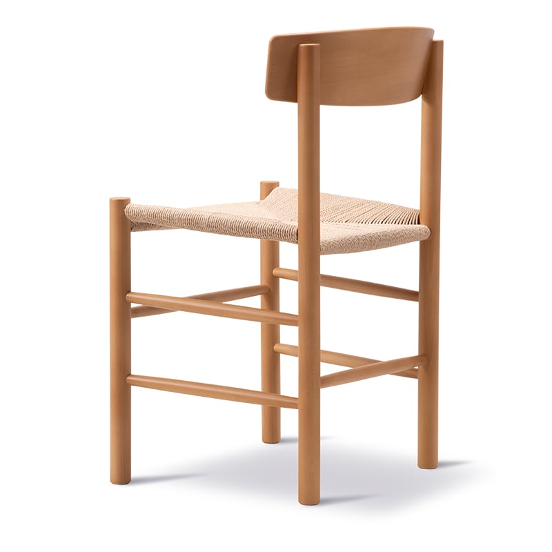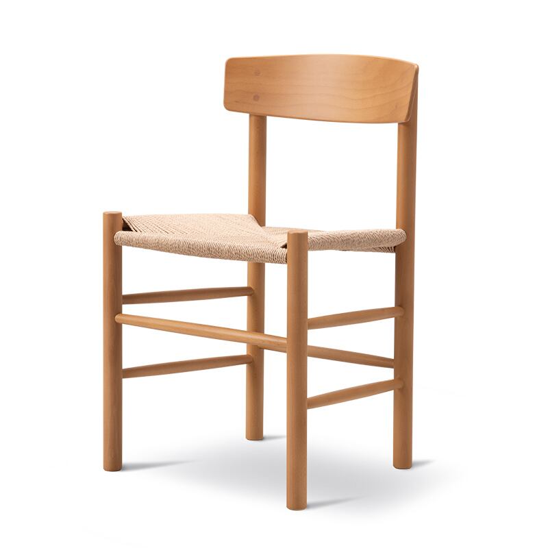 デンマーク家具デザインの原点といえる「J39モーエンセンチェア」。モーエンセンがFDB(生協)の家具デザイナーとして活躍していた際に、「適正な価格で強度のあるチェア」というミッションで作られたシェーカースタイルのダイニングチェア。彼の目指した「簡素で誠実なデザイン」が良く表現され、モーエンセンの代表作といえるチェアとなりました。洗練されたデザインと、手編みの座面、背もたれの快適性より75年以上絶えることなく生産され続け、世界で高い評価を得ています。建築大学やレストラン、ロイヤルコペンハーゲン工場の絵付の作業時のチェアとして採用されていたことから、その強度と長時間掛けても疲れない椅子として定評があります。