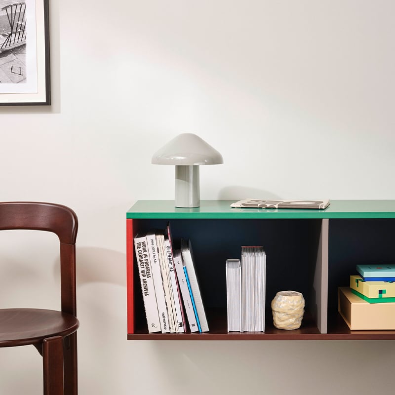 滑らかで艶のあるランプベースとシェードは、耐久性のあるポリカーボネート製。光源はシェードの内側、乳白色のポリカーボネート製ディフューザーの中にあり、光を効率よく拡散して手元をあたたかく照らします。コンパクトなデザインのため、家の中であちこち移動させたり、庭や屋外に持ち出したりもできます。さまざまな色からお選びいただけます。
