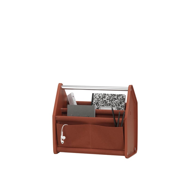 「ロッカー ボックス」は、シンプルで頑丈な構造です。再生プラスチック製の2つのサイドパネルは、アルミニウム製のパイプで結合されています。上のパイプは持ち手として機能し、残り5本のパイプには生地を使ったパネルが吊られ、キャリーケースの中を効率的に区切ります。軽量で、持ち運び可能なロッカーボックスは、オフィスだけでなくホームオフィスでも役立つ便利な製品です。ディープブラックRE、ダークグレーRE、シーブルーRE、ブリックREの4色のバリエーションを揃えています。
