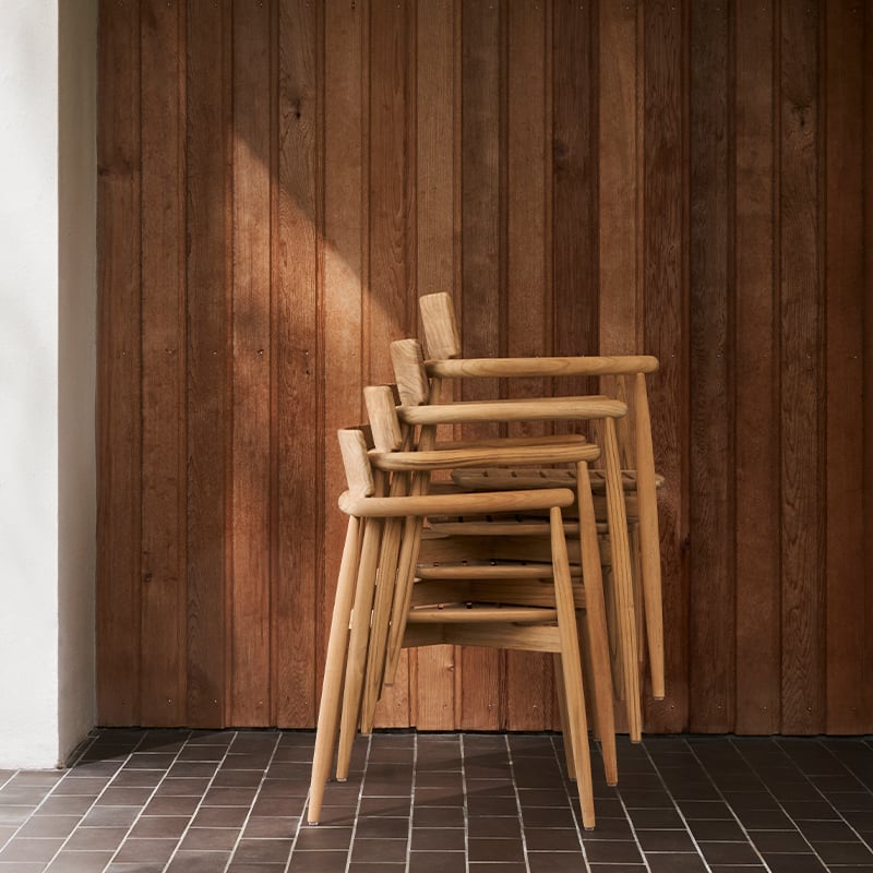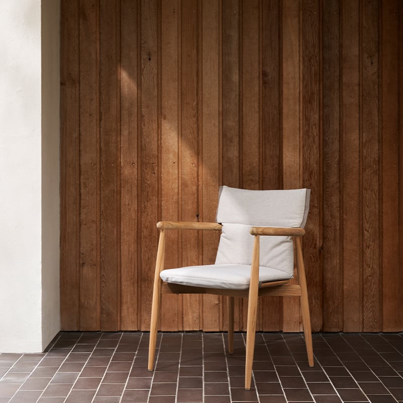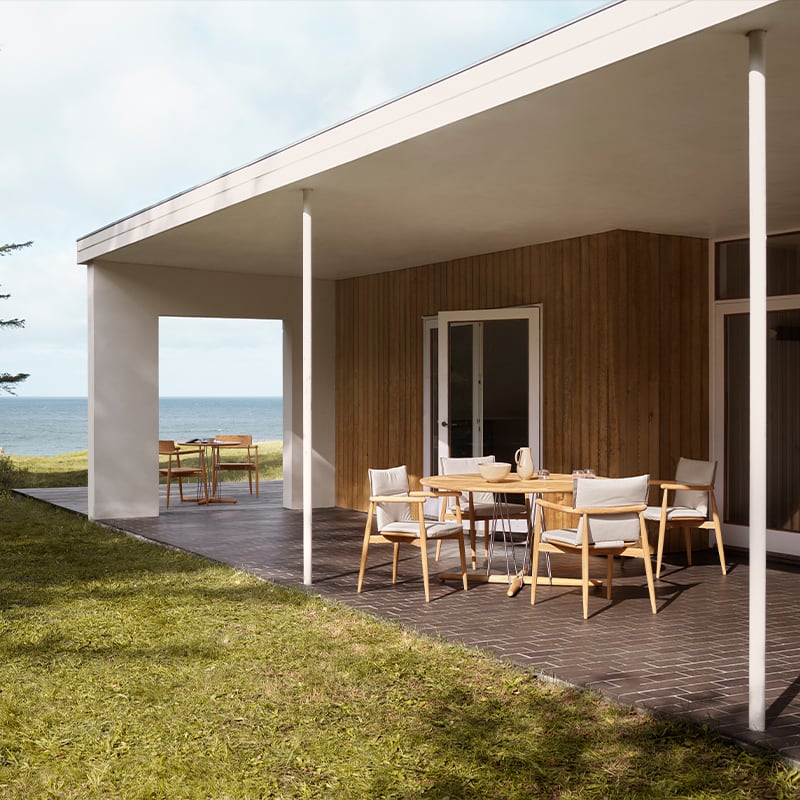 EOOSは、2015年以来、カール・ハンセン&サンのコレクションのコンテンポラリーな側面を代表する作品を発表してきました。EOOSの3人のデザイナーは、テーブル、椅子、ソファで構成される既存のEmbraceシリーズをそのまま継承・拡充するEmbraceアウトドアシリーズを発表しました。この上ない快適さとくつろぎがアウトドアでも実現します。「完全さと不完全さ」を探求し続けるEOOSは、EOO5 Embraceアームチェアと同様のデザインが反映されたE008 Embraceアウトドアチェアを生み出しました。EOOSの3人は、屋内での食事の時間を再現できるような、新しいタイプのアウトドア家具づくりを目指してきました。柔らかな布張りのクッションがFSC®認証チーク材のフレームを包み込み、すっきりとしていながら緻密なデザインの木材とファブリックが、エレガントなコントラストを演出します。取り外し可能なクッションは丈夫で耐候性に優れた生地でできており、使い心地の良さと美しさを併せ持っています。未処理のチーク材が持つ風合いを一層際立たせ、アームの接合部やシート下面のトラス組みには高度な職人技が見て取れます。E008 Embraceアウトドアダイニングチェアは、積み重ねて収納することもでき、E022 Embraceダイニングテーブルとマッチします。