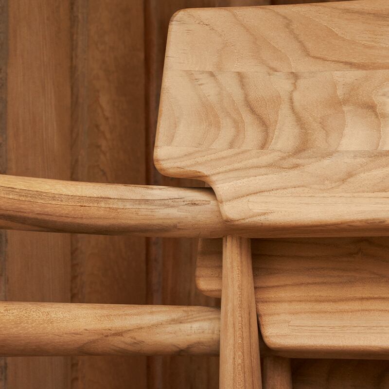 チーク材は含有する天然の油分により、耐風性、耐候性に優れるほか、カビや腐敗、害虫を遠ざける性質を持っていいます。屋外で使用する家具には適しています。屋外家具には、FSC®認証を受けたチーク材を使用しています。