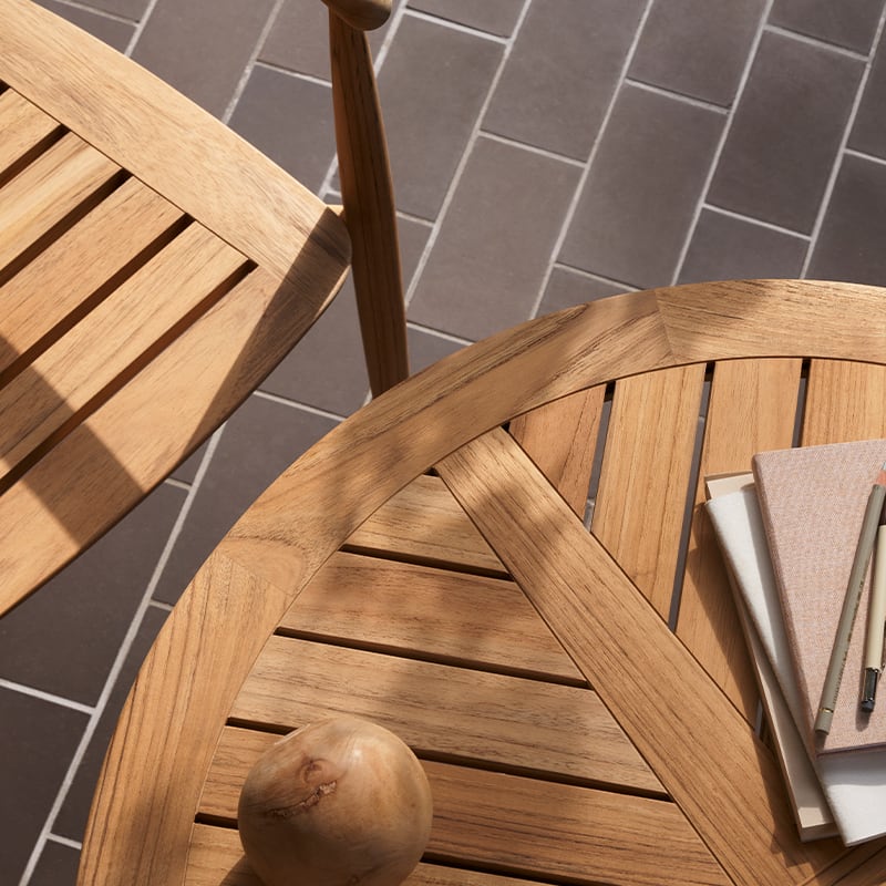 チーク材は含有する天然の油分により、耐風性、耐候性に優れるほか、カビや腐敗、害虫を遠ざける性質を持っていいます。屋外で使用する家具には適しています。屋外家具には、FSC®認証を受けたチーク材を使用しています。