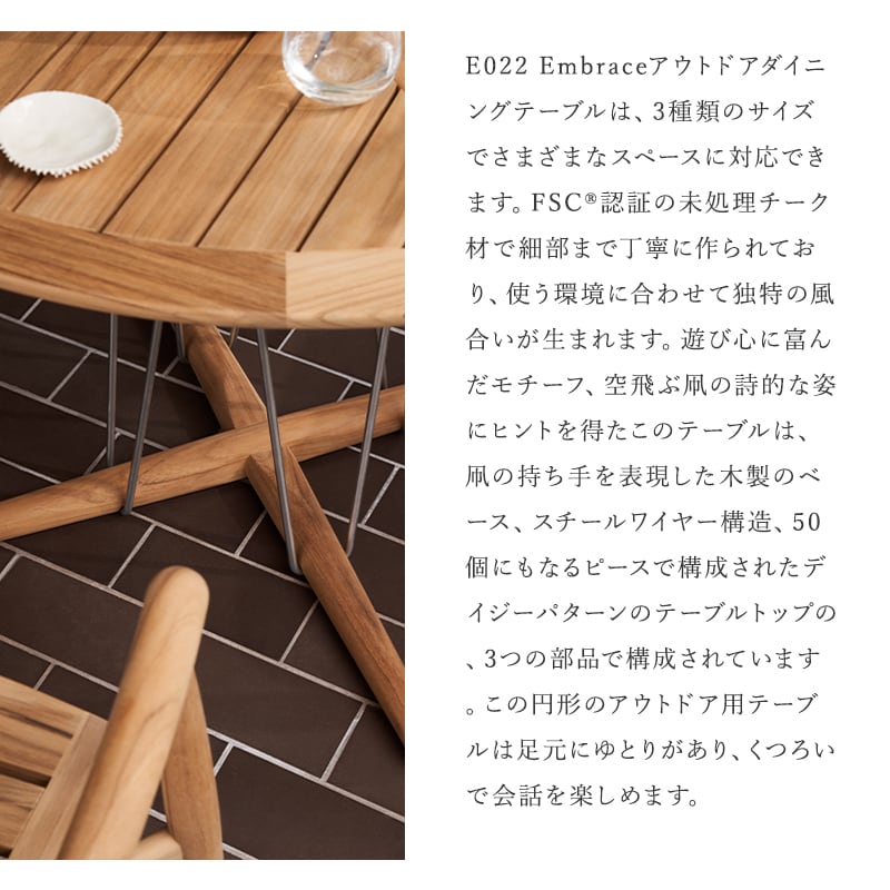 EOOSは、2015年以来、カール・ハンセン&サンのコレクションのコンテンポラリーな側面を代表する作品を発表してきました。EOOSの3人のデザイナーは、テーブル、椅子、ソファで構成される既存のEmbraceシリーズをそのまま継承・拡充するEmbraceアウトドアシリーズを発表しました。この上ない快適さとくつろぎがアウトドアでも実現します。E022 Embraceアウトドアダイニングテーブルは、3種類のサイズでさまざまなスペースに対応できます。FSC®認証の未処理チーク材で細部まで丁寧に作られており、使う環境に合わせて独特の風合いが生まれます。EOOSの詩的なデザインから生まれたテーブルは、まるで宙に浮いているかのような軽快な表情です。Embraceシリーズに共通する遊び心に富んだモチーフ、空飛ぶ凧の詩的な姿にヒントを得たこのテーブルは、凧の持ち手を表現した木製のベース、スチールワイヤー構造、50個にもなるピースで構成されたデイジーパターンのテーブルトップの、3つの部品で構成されています。この円形のアウトドア用テーブルは足元にゆとりがあり、くつろいで会話を楽しめます。また、同シリーズの布張りのEOO8 Embrace アウトドアダイニングチェアとマッチします。