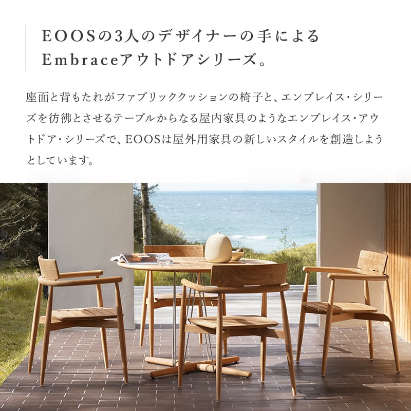 EOOSは、2015年以来、カール・ハンセン&サンのコレクションのコンテンポラリーな側面を代表する作品を発表してきました。EOOSの3人のデザイナーは、テーブル、椅子、ソファで構成される既存のEmbraceシリーズをそのまま継承・拡充するEmbraceアウトドアシリーズを発表しました。この上ない快適さとくつろぎがアウトドアでも実現します。E022 Embraceアウトドアダイニングテーブルは、3種類のサイズでさまざまなスペースに対応できます。FSC?認証の未処理チーク材で細部まで丁寧に作られており、使う環境に合わせて独特の風合いが生まれます。EOOSの詩的なデザインから生まれたテーブルは、まるで宙に浮いているかのような軽快な表情です。Embraceシリーズに共通する遊び心に富んだモチーフ、空飛ぶ凧の詩的な姿にヒントを得たこのテーブルは、凧の持ち手を表現した木製のベース、スチールワイヤー構造、50個にもなるピースで構成されたデイジーパターンのテーブルトップの、3つの部品で構成されています。この円形のアウトドア用テーブルは足元にゆとりがあり、くつろいで会話を楽しめます。また、同シリーズの布張りのEOO8 Embrace アウトドアダイニングチェアとマッチします。