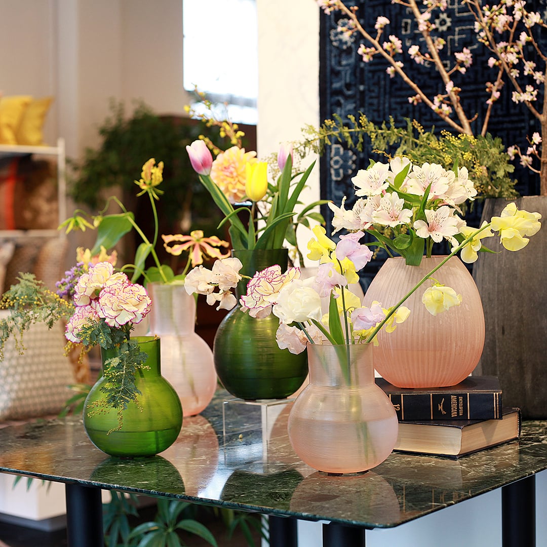 すべて職人によるハンドメイドで製造されています。ヨーロッパなどのホテルやショールームにもGUAXSのフラワーベースが数多くディスプレイされるなど、世界中の人々に支持されています。また、ブーケはもちろんシンプルな枝ものや一輪の花を、美しく見せてくれるだけでなく花を活けずにオブジェとして置いてあるだけでも存在感のあるフラワーベースです。