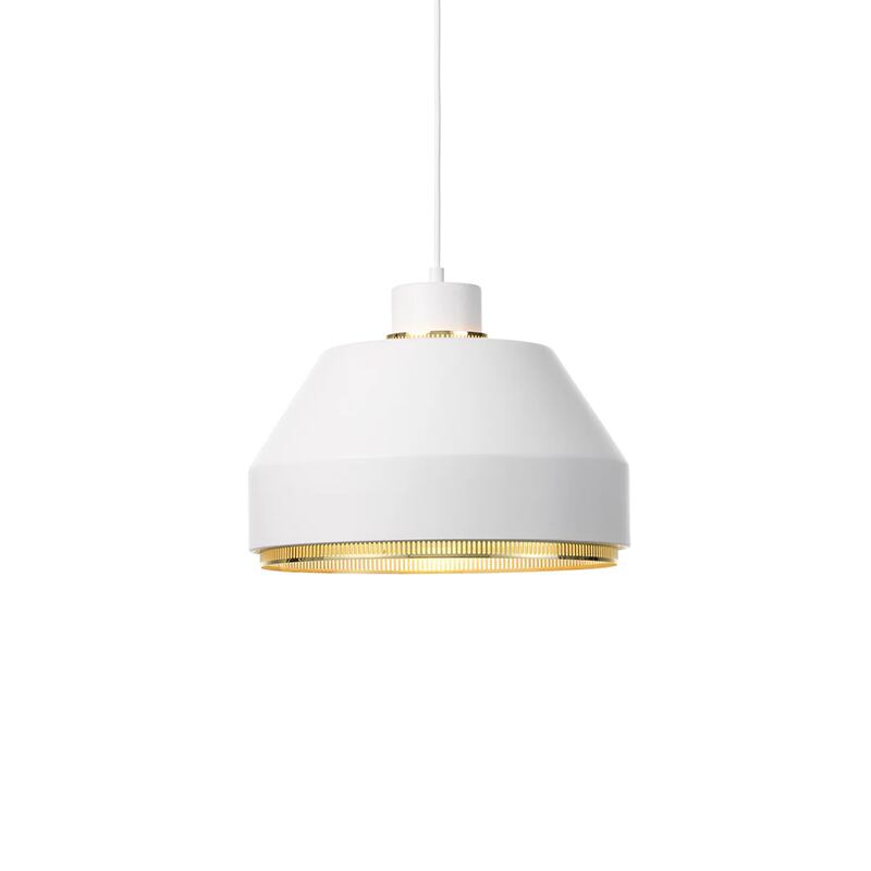 アルヴァ・アアルトとアイノ・アアルトがともに設計したマイレア邸は、20世紀建築の中でも類を見ない傑作住宅として知られています。現代でも、マイレア邸の図書室では「ペンダント AMA500」が、温かな光を灯しています。柔らかな光を放つスチール製のペンダントライトは、ダイニングテーブルやデスク上の一灯として吊るすのに最適なサイズです。幅の広い開口部からは豊かな光が落ち、シェード上部の真鍮リングは、わずかに上部から漏れるよう計算された光を反射して美しく輝きます。外側と同じくホワイトに塗装されたシェードの内側で反射し合い明るさを増した光は、開口部の真鍮リングを通ることで、まぶしさが軽減され、柔らかく放たれます。