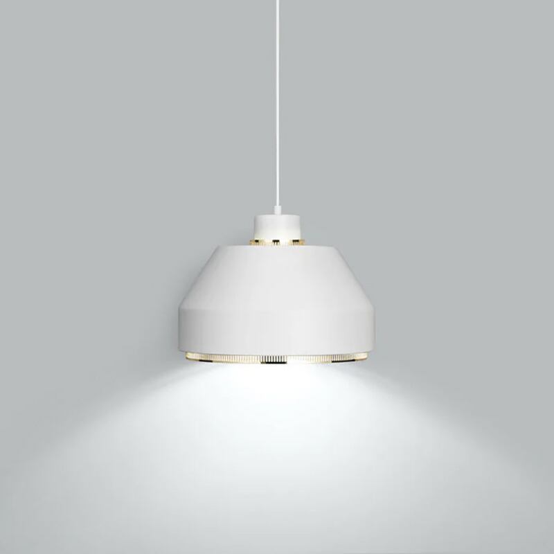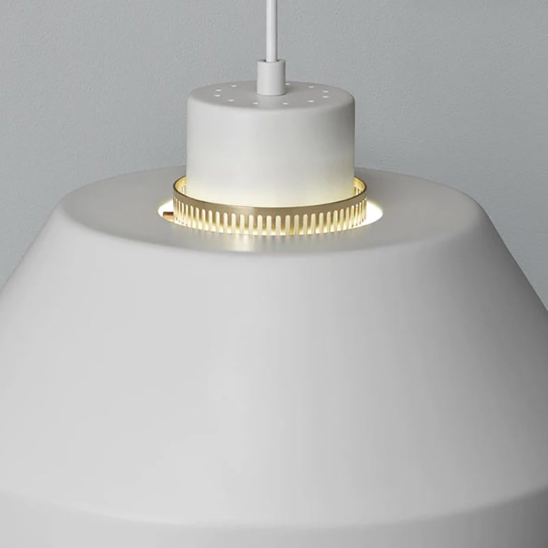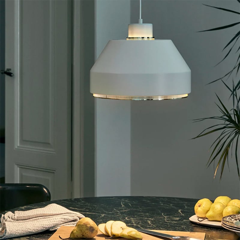 アルヴァ・アアルトとアイノ・アアルトがともに設計したマイレア邸は、20世紀建築の中でも類を見ない傑作住宅として知られています。現代でも、マイレア邸の図書室では<ペンダント AMA500>が、温かな光を灯しています。柔らかな光を放つスチール製のペンダント AMA500は、ダイニングテーブルやデスク上の一灯として吊るすのに最適なサイズです。幅の広い開口部からは豊かな光が落ち、シェード上部の真鍮リングは、わずかに上部から漏れるよう計算された光を反射して美しく輝きます。外側と同じくホワイトに塗装されたシェードの内側で反射し合い明るさを増した光は、開口部の真鍮リングを通ることで、まぶしさが軽減され、柔らかく放たれます。